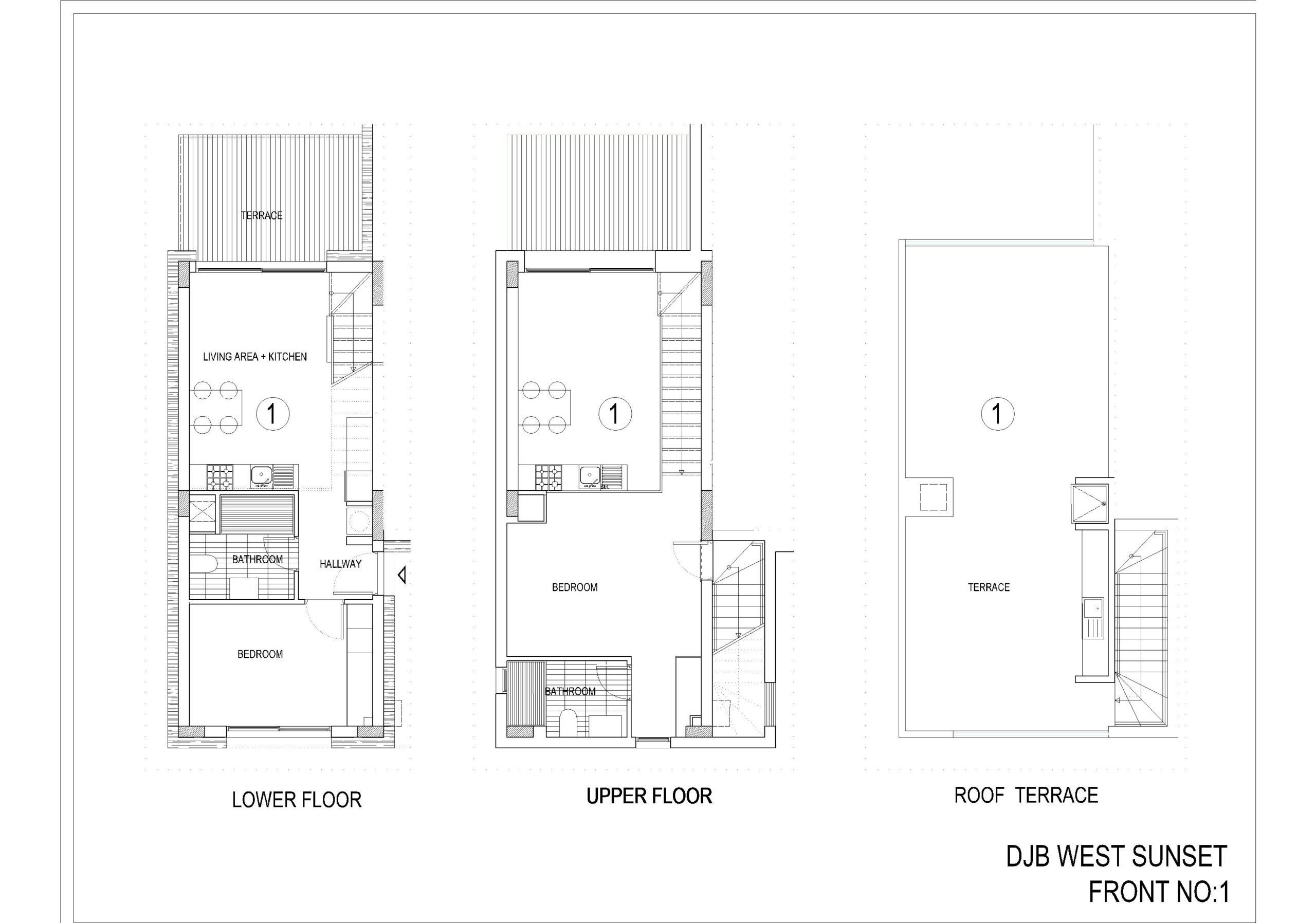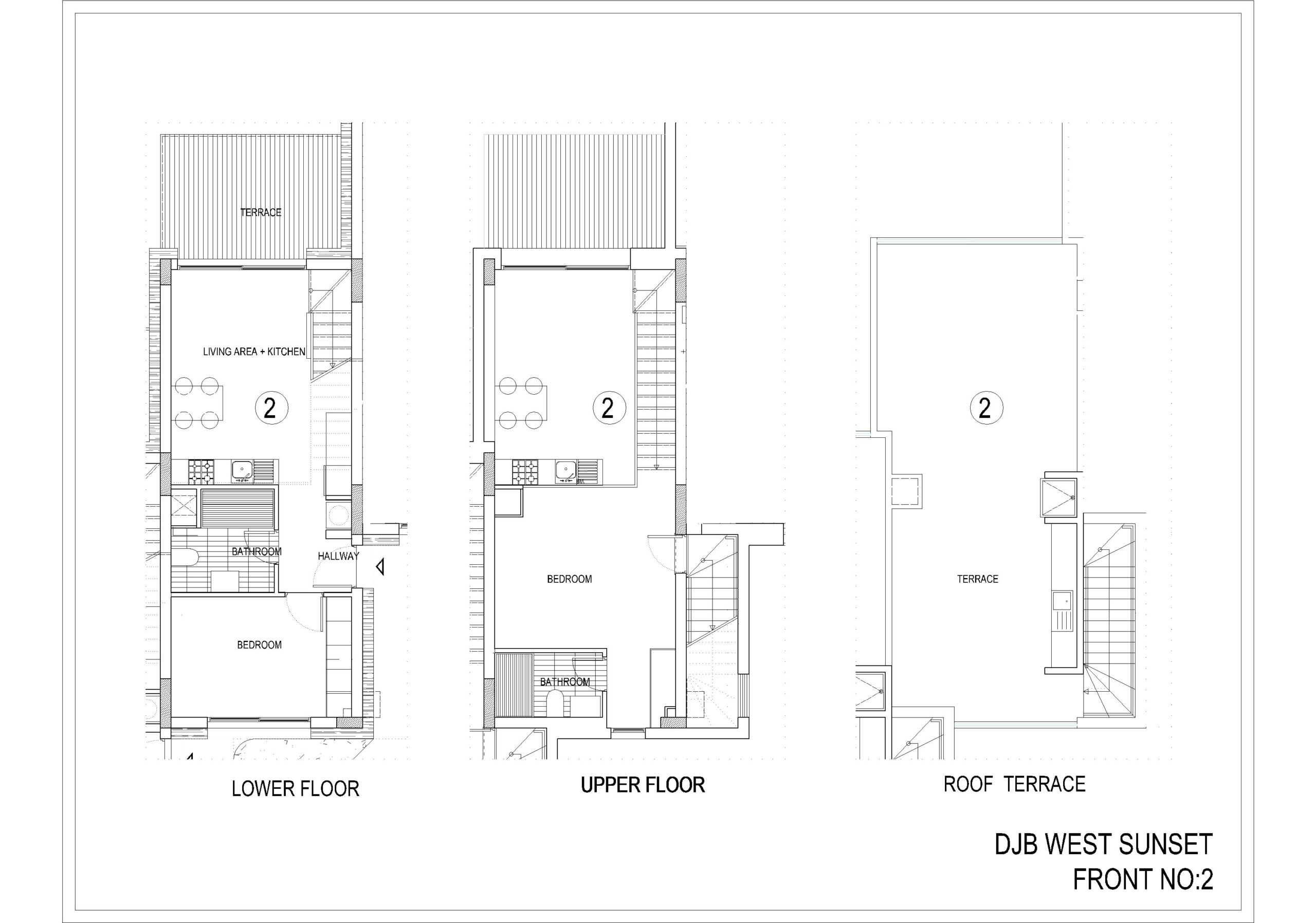 - Townhouse: begane grond en 1ste verdieping, met 2 slaapkamers en 2 badkamers, 81-100m2 woonoppervlak, 12m2 terras en 50m2 dakterras. er zijn 2 types, zie plattegronden. Type 1 heeft 81m2 woonoppervlak en type 2 heeft 100m2 woonoppervlak