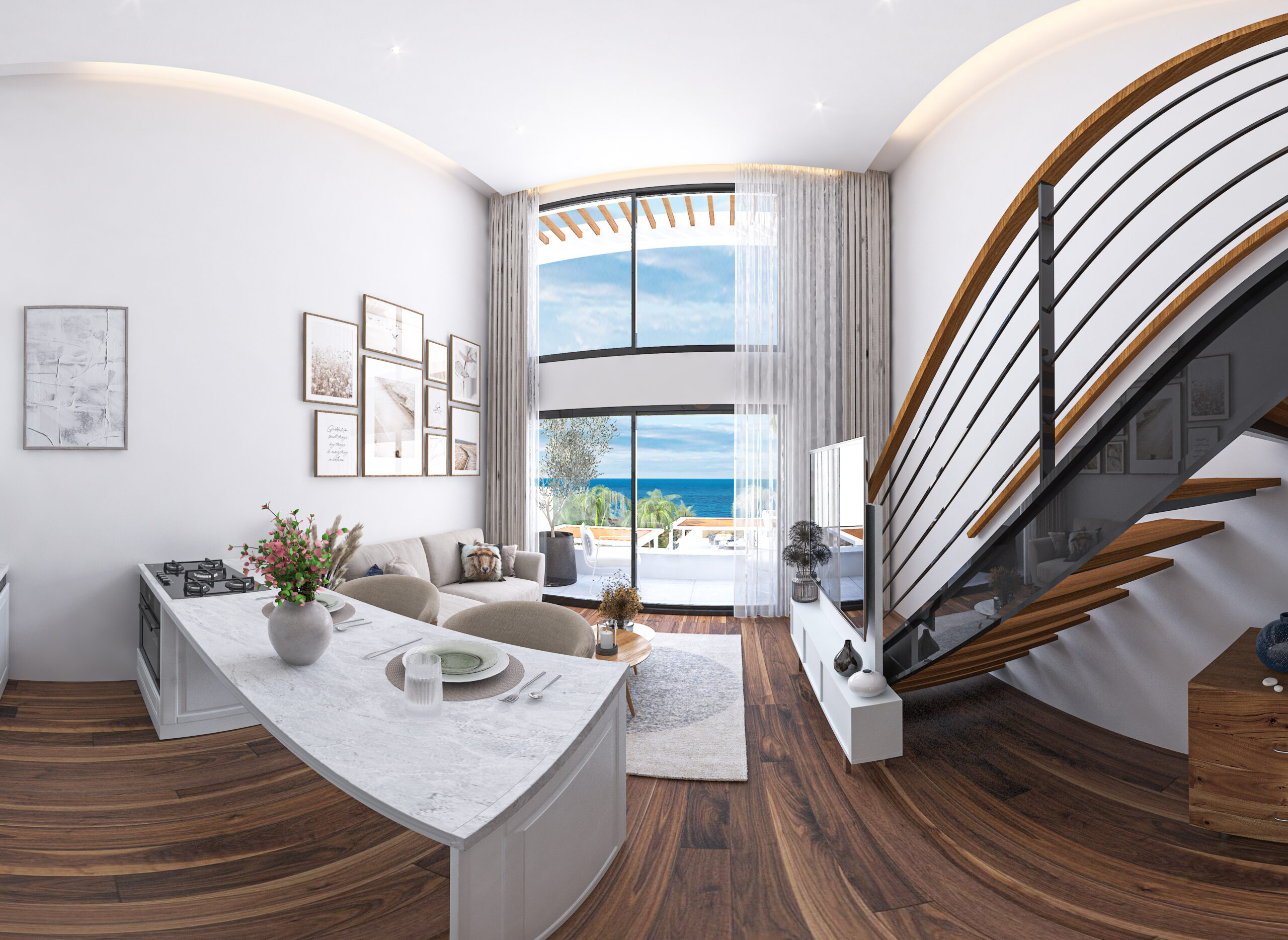 - Duplex Penthouse: eerste verdieping, 2 slaapkamers, 2 badkamers, 81m2 woonoppervlak, 6m2 balkon en 50m2 dakterras
