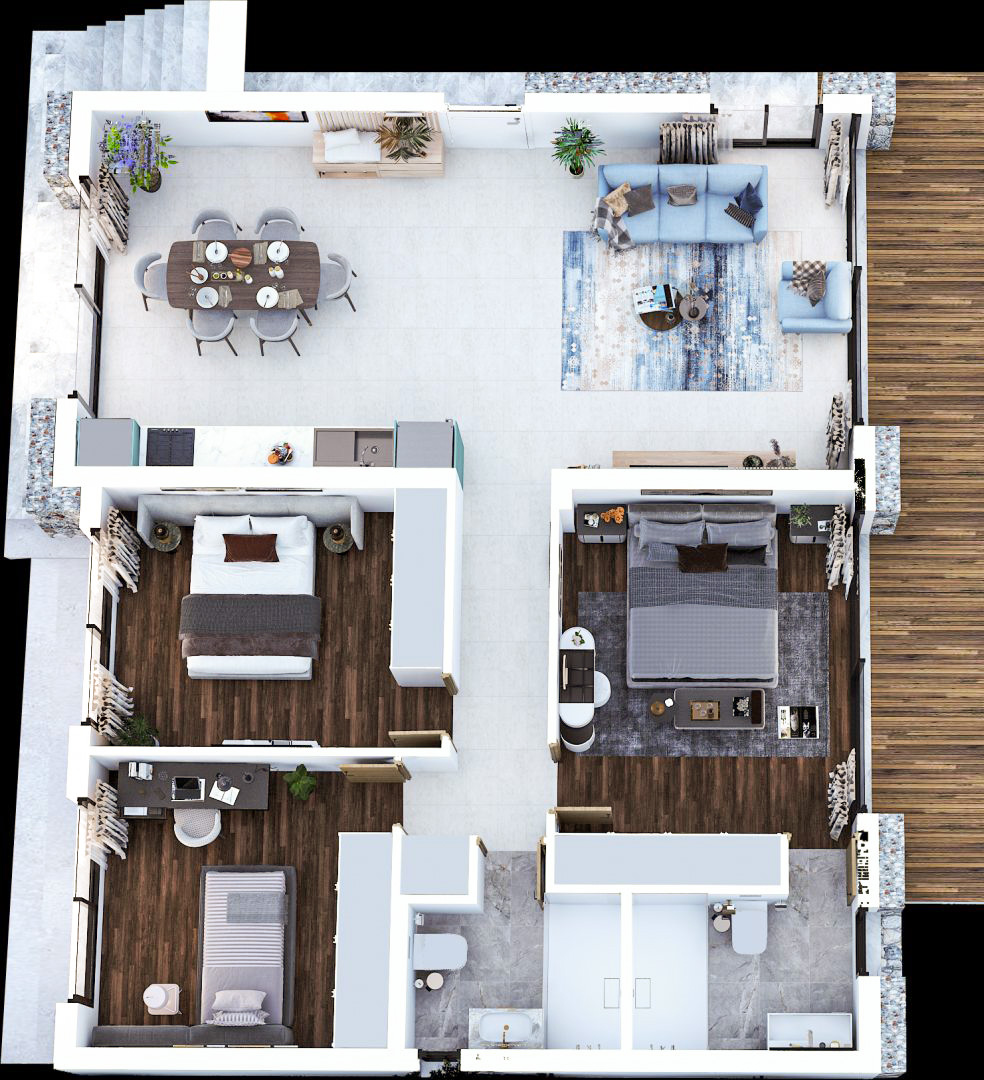 - 3+1 Bungalow, 3 slaapkamer : woonoppervlak vanaf 125 m2, terras 65 m2, dakterras 120 m2
